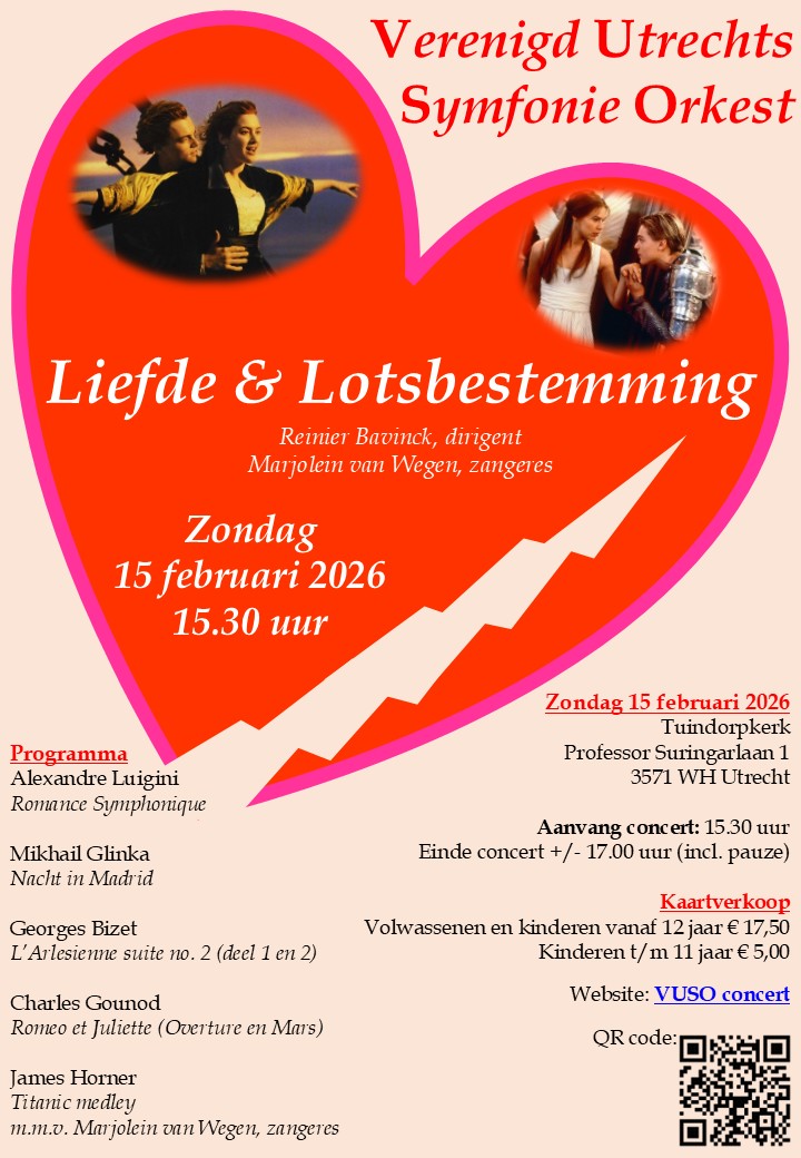 Het Verenigd Utrechts Symfonieorkest (VUSO) speelt op 15 februari een programma dat geheel in het teken staat van de liefde in uitzonderlijke situaties. Niets heeft kunstenaars meer geïnspireerd dan het thema liefde, vooral omdat het zo veel verschillende aspecten heeft. Van prille romantiek tot onmogelijke of zelfs noodlottige liefde. Tijdens dit concert nemen we jullie mee in hoe liefde in al zijn vormen voorkomt in de muziek.